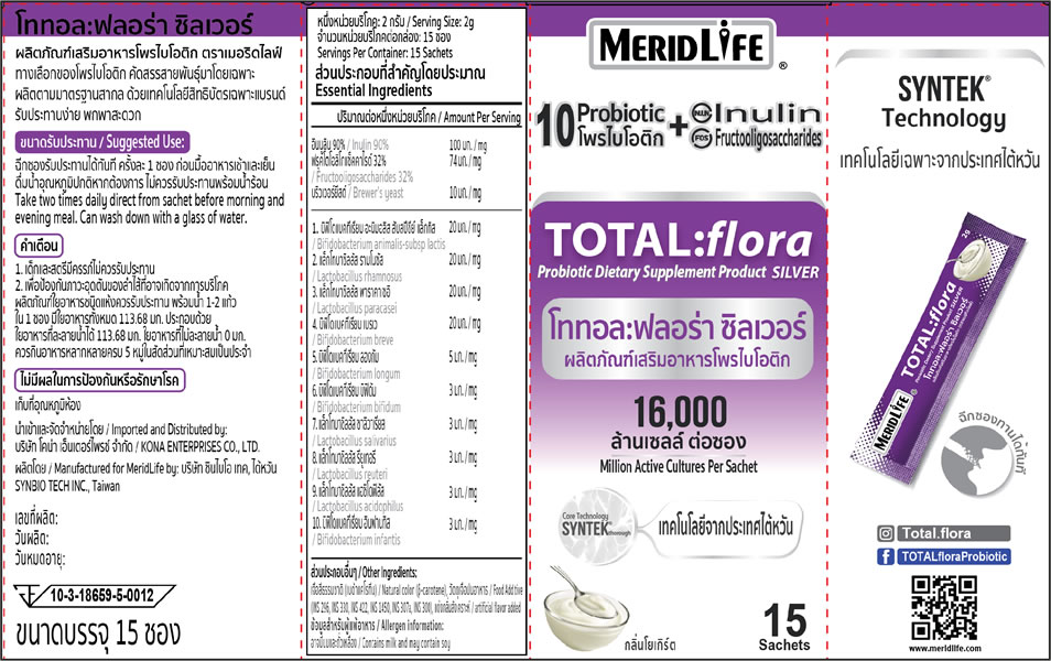 TOTAL: FLORA SILVER (PROBIOTIC DIETARY SUPPLEMENT PRODUCT) (MERIDLIFE (TM)) Probiotic specialty formula is a powerful probiotic supplement that contains a high percentage of Bifidobacteria and Lactobacilli to help replenish the beneficial bacteria that rapidly decline in adults and seniors. Silver will restore the number and diversity of necessary microflora.