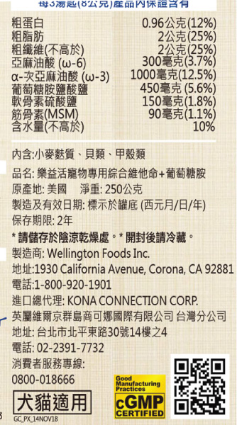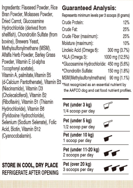 • Omega fatty acids to reduce inflammation and promote joint mobility, healthy skin & coat and energy support.